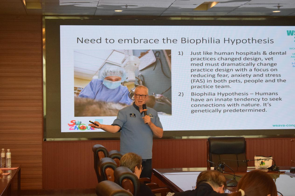 随后,Dr. Marty Becker作了题为《Reducing “white coat anxiety” through environmental modification and approaches to sedation 如何通过环境调整及镇静等方法减轻就诊动物“白大褂焦虑”现象》的报告。他强调,“白大褂焦虑”不仅影响动物的就诊体验,还可能对诊疗效果产生不利影响。通过综合运用环境设计、行为干预和镇静技术等策略,可以有效提升动物的就诊舒适度,这对于动物的健康和福利至关重要。