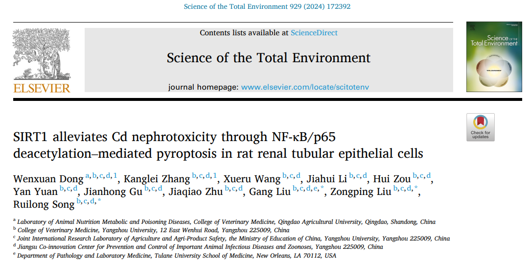 近日,以伟德victor1946为第一单位,伟德victor1946陈甫课题组成员董文轩教师联合扬州大学刘宗平课题组共同完成的《SIRT1 alleviates Cd nephrotoxicity through NF-κB/p65 deacetylation–mediated pyroptosis in rat renal tubular epithelial cells》的文章在一区Top期刊(IF=9.8)《Science of The Total Environment》杂志在线发布。该项研究成果揭示了焦亡在重金属镉诱发肾损伤的毒性机制。