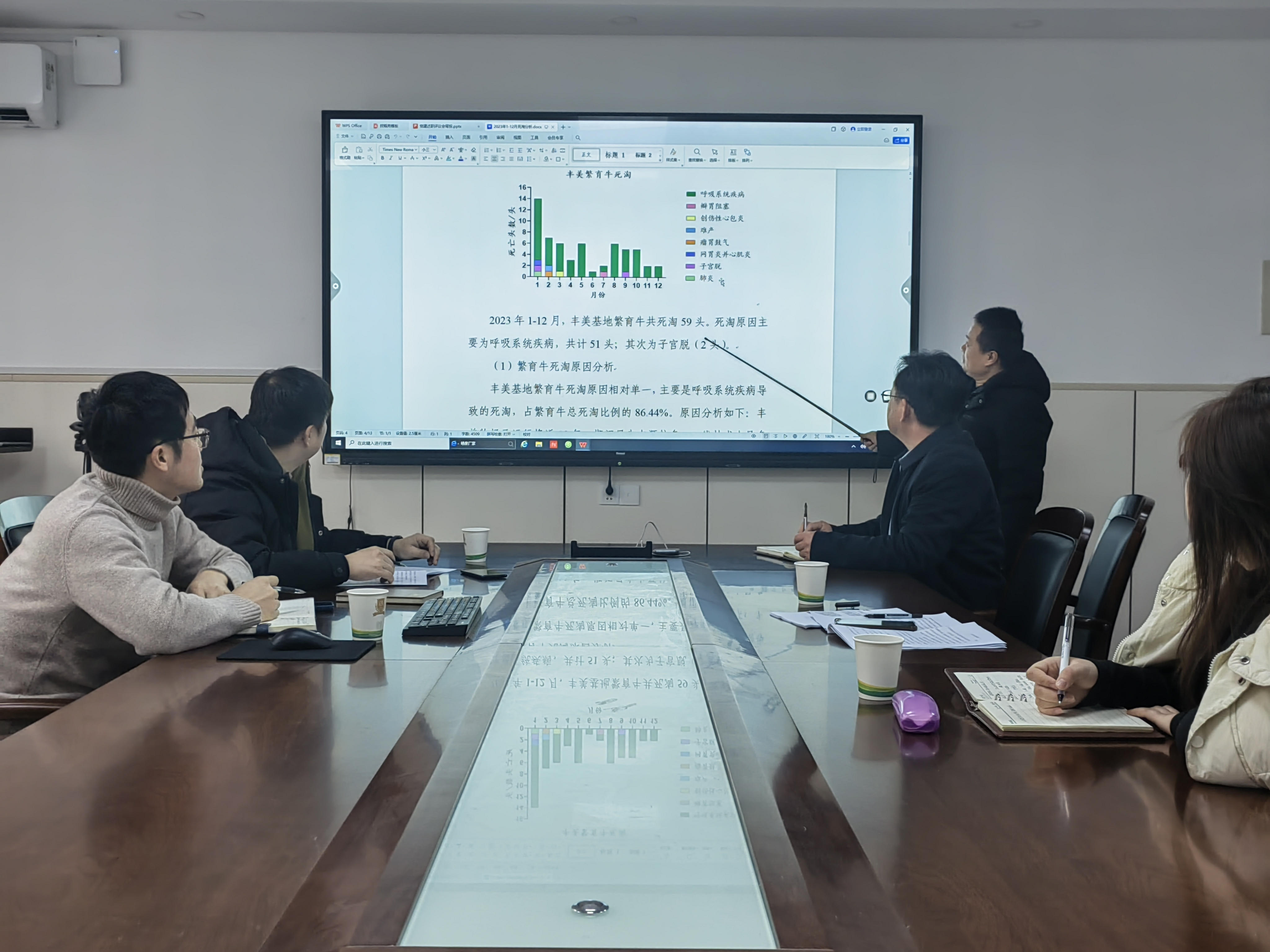 会上,邹明教授分别对隆铭牛丰美基地、五莲基地、新疆基地不同阶段肉牛的死淘数量和原因进行了分析总结。随后,刘焕奇教授和其他与会人员就此展开深入探讨交流,并围绕肉牛生产和生活环境、饲养密度、场区和车辆设备消毒情况、生物安全防控、免疫接种、母带犊饲养模式现存问题、相关疾病病因检测等方面分别为各基地犊牛、繁育牛和育成牛的合理饲养提出了疾病防控建议方案。