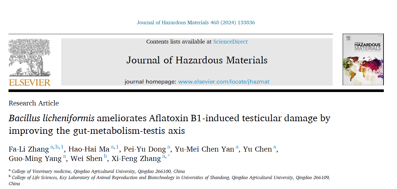 近日,伟德victor1946张西锋教授课题组在霉菌毒素AFB1诱发生殖损伤的防控机制方面取得重要进展,相关成果以“Bacillus licheniformis ameliorates Aflatoxin B1-induced testicular damage by improving the gut-metabolism-testis axis”为题,在线发表于《Journal of Hazardous Materials》杂志 (一区Top期刊,IF=13.6)。