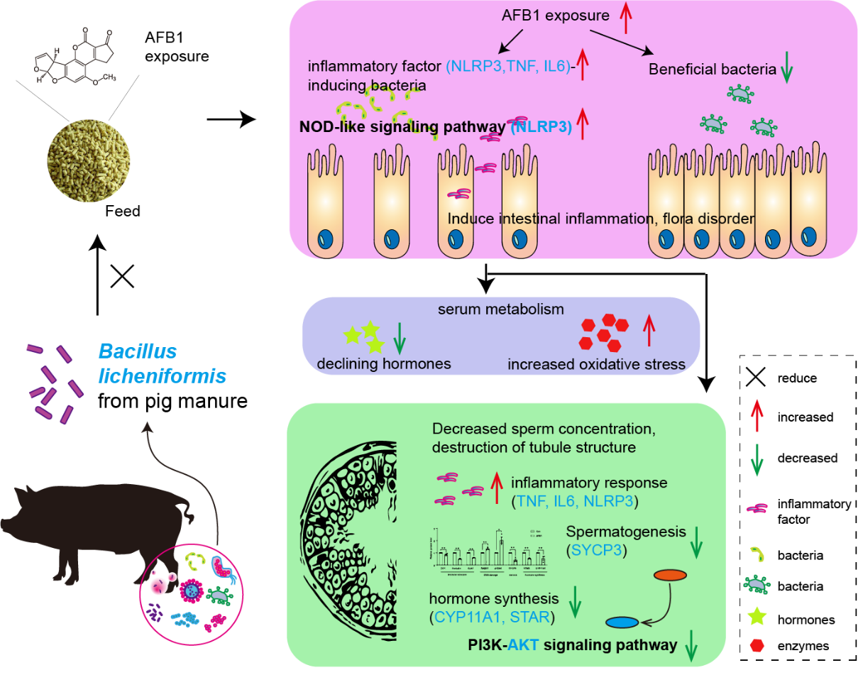 张西锋课题组建立了猪睾丸(ST)细胞体外培养检测模型和小鼠体内实验模型,并以此为模型研究和揭示了地衣芽孢杆菌具有显著改善 AFB1 暴露诱发的睾丸损伤的能力,并进一步揭示了AFB1损害睾丸发育的机制:(i)AFB1通过影响血睾屏障和减数分裂相关基因转录直接导致睾丸发育损害,全转录组测序的KEGG分析表明差异表达的基因和lncRNAs富集在 PI3K-AKT信号通路;(ii)AFB1通过损伤肠道,引起肠道炎症,间接影响睾丸发育,这与血液循环系统和NOD样信号通路有关; (iii) AFB1引起代谢紊乱,表现为氧化应激增加和激素合成抑制。