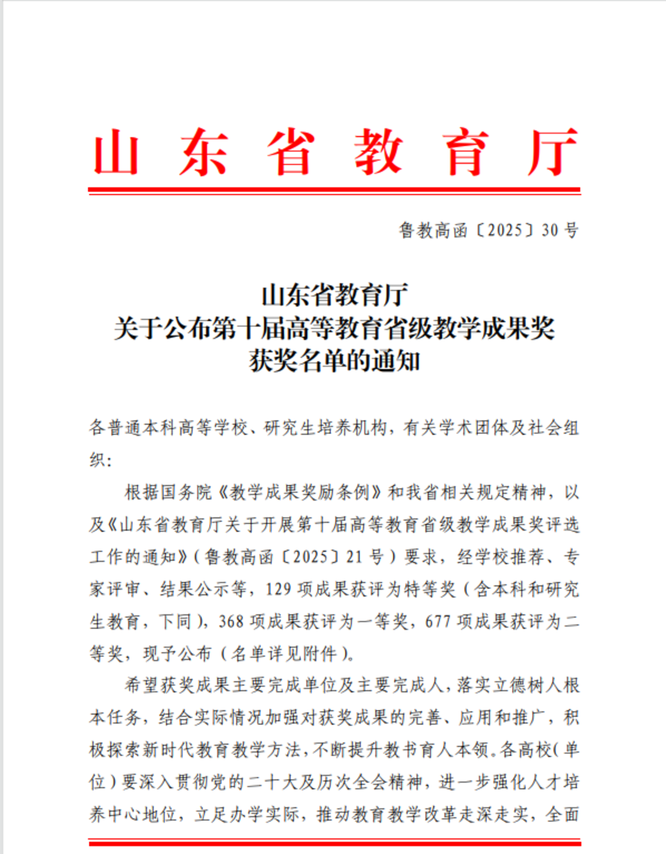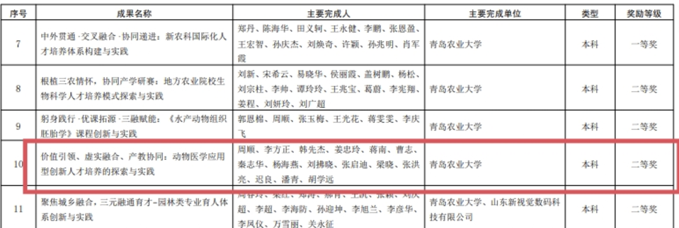 近日,山东省教育厅公布了第十届高等教育省级教学成果奖获奖名单。由伟德victor1946周顺教授作为主要完成人,李方正、韩先杰、姜忠玲、蒋南、曹志、秦志华、杨海燕、刘拂晓、张启迪、梁晓、张洪亮、迟良、潘青、胡学远等教师共同完成的成果《价值引领、虚实融合、产教协同:动物医学应用型创新人才培养的探索与实践》,荣获本科类教学成果二等奖。