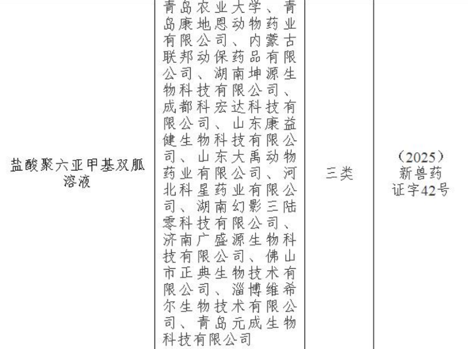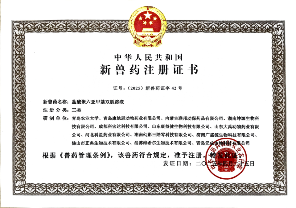 4月27日,农业农村部发布第901号公告,由伟德victor1946动物疫病防控制剂创新团队秦志华老师联合青岛康地恩动物药业等国内动保企业共同研发的新兽药“盐酸聚六亚甲基双胍溶液”,喜获国家三类新兽药证书,新兽药证书号为(2025)新兽药证字42号。