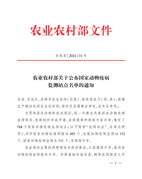 国家动物疫病监测点建设是贯彻落实动物防疫法的规定,健全完善国家动物疫病监测体系的一项重要措施。农业农村部本次确定了768个国家动物疫病监测站点,其中国家动物疫情测报站485个、边境动物疫情监测站152个、国家动物疫病监测点131个,有效期5年。