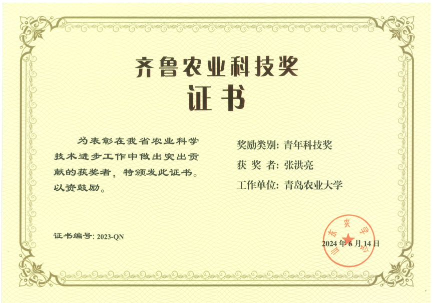 在本届奖励大会上,张洪亮副教授同时荣获齐鲁农业科技奖青年科技奖。作为公司动物疫病防控制剂创新团队负责人,张洪亮副教授带领团队一直致力于兽用生物制品、兽医诊断试剂等开发,以及动物疫病防控技术的推广应用工作。先后主持国家重点研发计划子课题、山东省重点研发计划、山东省自然科学基金等项目10余项,累计发表学术论文40余篇,出版《高级动物传染病学》等教材和著作3部,授权发明专利17件,制定行业标准和团体标准19项,累计获得各级科技奖励和表彰18项。