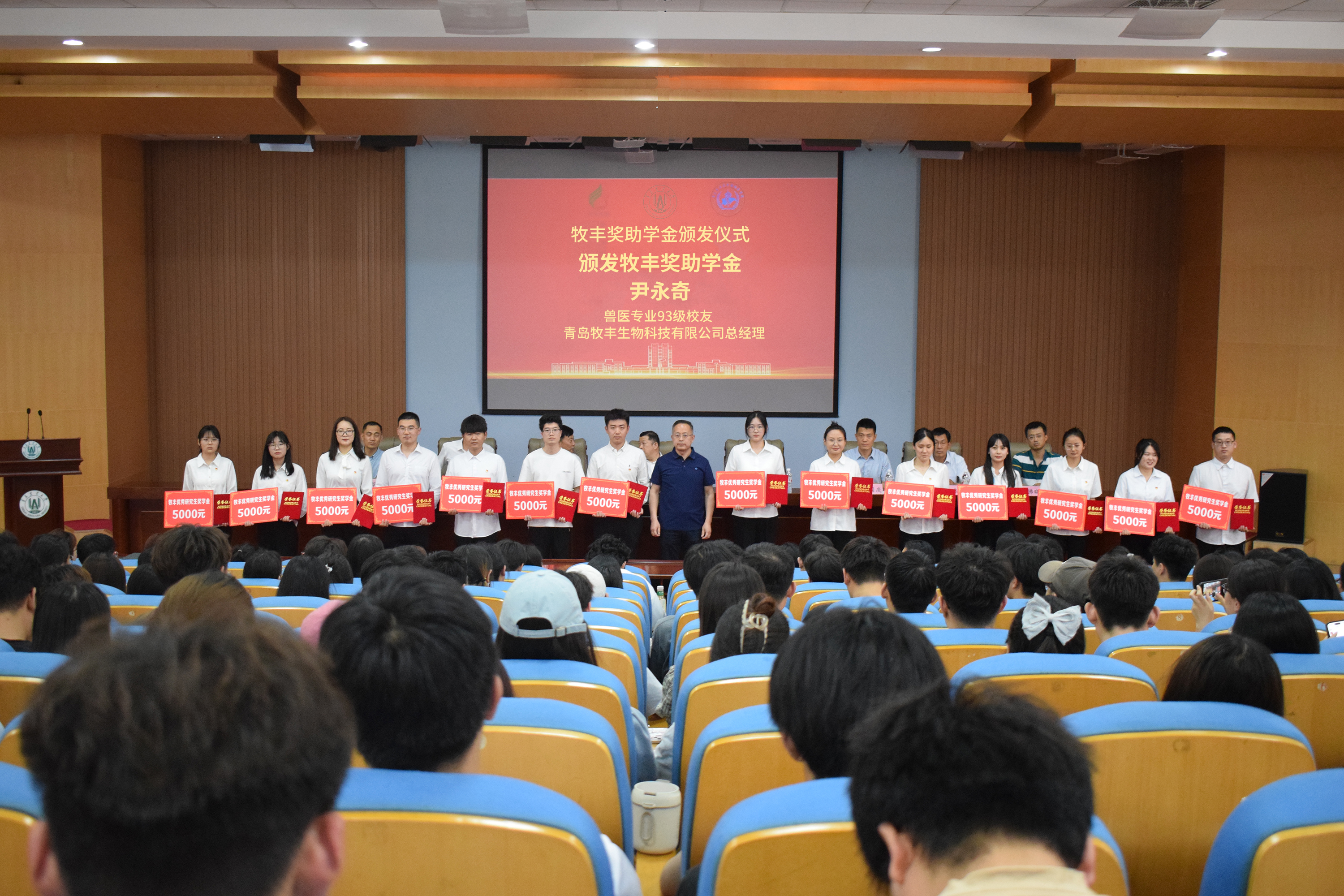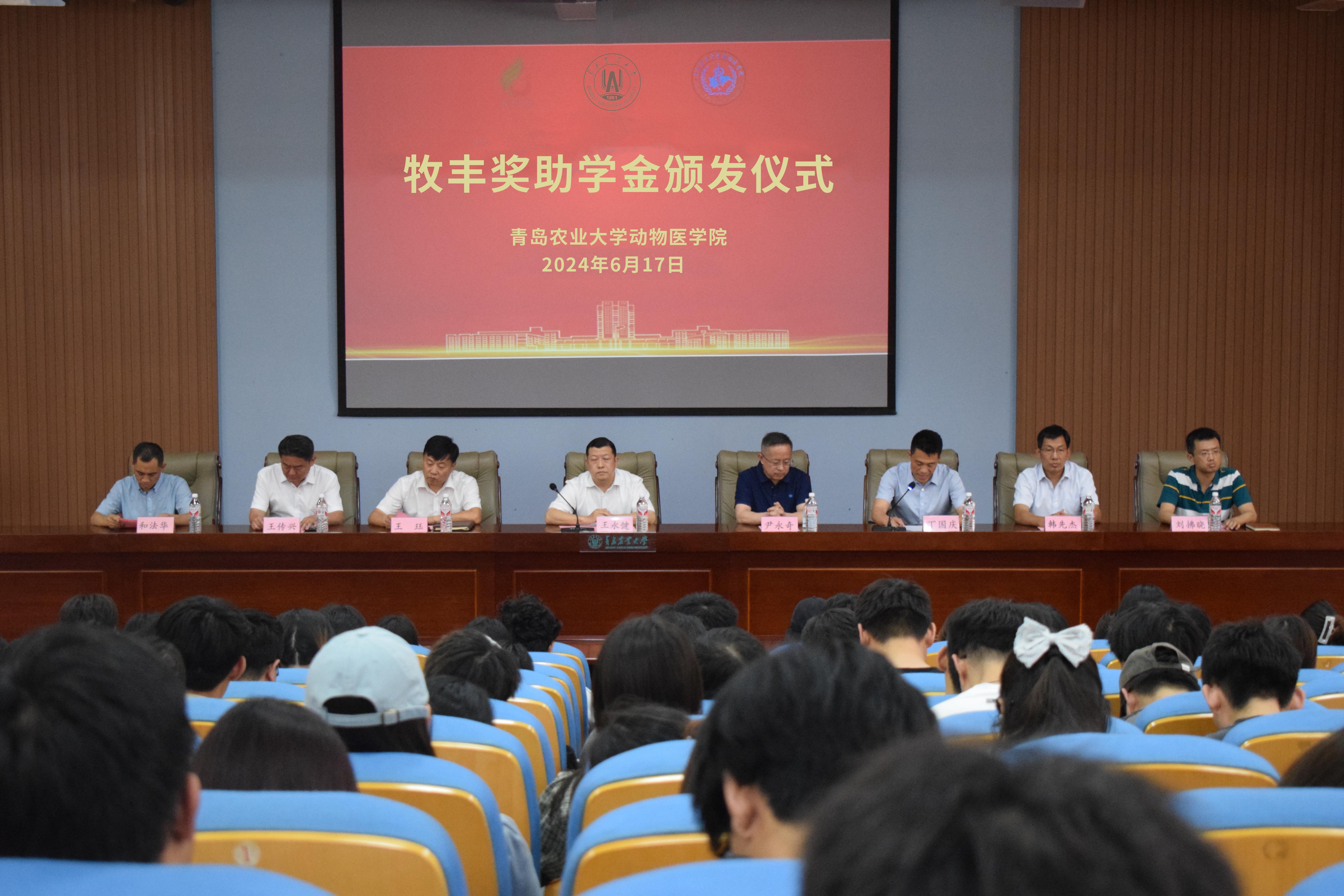 6月17日,伟德victor1946在校学术会馆第三报告厅举行牧丰奖助学金颁发仪式。公司党委委员、副董事长王永健,公司兽医专业93级优秀员工、青岛牧丰生物科技有限公司总经理尹永奇,社会合作处处长王珏等出席仪式。伟德victor1946党委书记丁国庆主持颁发仪式。