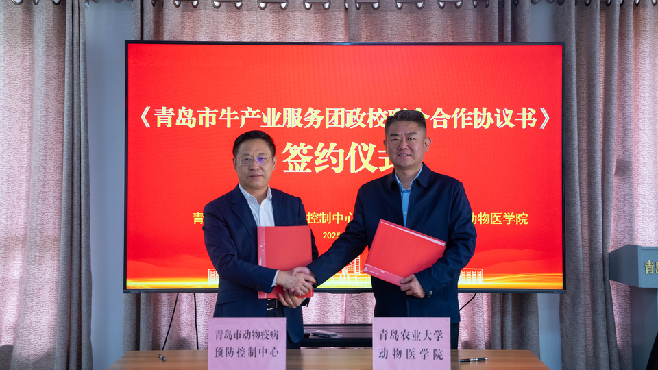 10月24日,山东省科技特派员青岛市牛产业服务团校园服务队联合共同体授旗暨服务启动仪式在青岛市动物疫病预防控制中心成功举行。青岛市动物疫病预防控制中心主任、青岛市牛产业服务团团长李彦与伟德victor1946伟德victor1946党委副书记王传兴代表双方共同签署《青岛市牛产业服务团政校联合合作协议书》,标志着政校共建的牛产业协同服务机制正式建立。