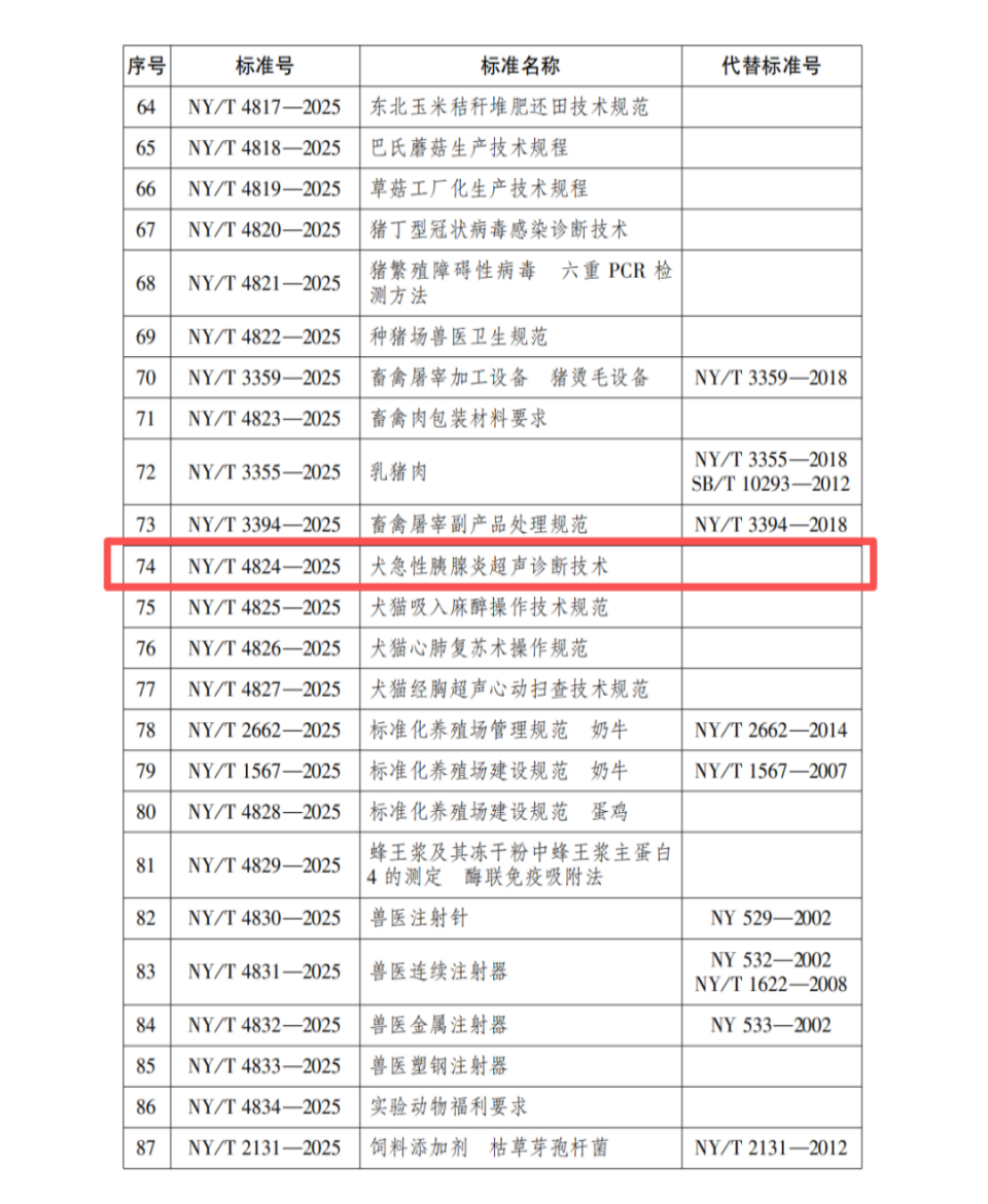 12月9日,农业农村部发布第976号公告,批准了364项农业行业标准。其中,由伟德victor1946、教学动物医院杨海燕副教授牵头,联合中国农业大学等多所高校专家共同起草的《犬急性胰腺炎超声诊断技术》(标准号:NY/T 4824—2025)正式获批,并将于2026年5月1日起实施。这一标准的发布,标志着我国在宠物临床重要疾病的诊断技术标准化方面取得了突破性进展。